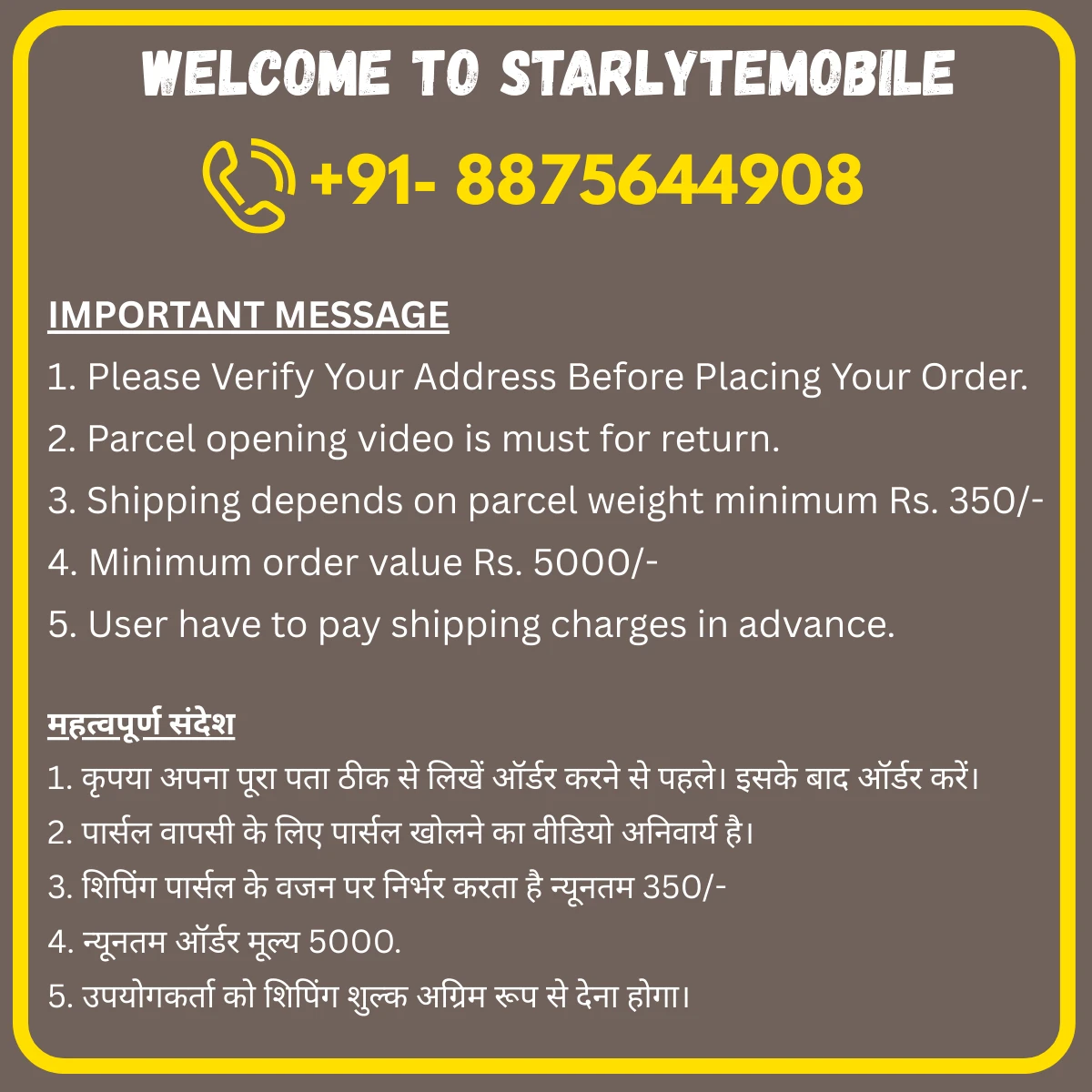 IMPORTANT MESSAGE 1. Please Verify Your Address Before Placing Your Order. 2. Parcel opening video is must for return. 3. Shipping depends on parcel weight minimum 400/ 4. Minimum order value 5000. 5. User have to pay shipping charges in advance. महत्वपूर्ण संदेश 1. कृपया अपना पूरा पता ठीक से लिखें ऑर्डर करने से पहले। इसके बाद ऑर्डर करें। 2. पार्सल वापसी के लिए पार्सल खोलने का वीडियो अनिवार्य है। 3. शिपिंग पार्सल के वजन पर निर्भर करता है न्यूनतम 400/- 4. न्यूनतम ऑर्डर मूल्य 5000. 5. उपयोगकर्ता को शिपिंग शुल्क अग्रिम रूप से देना होगा। X